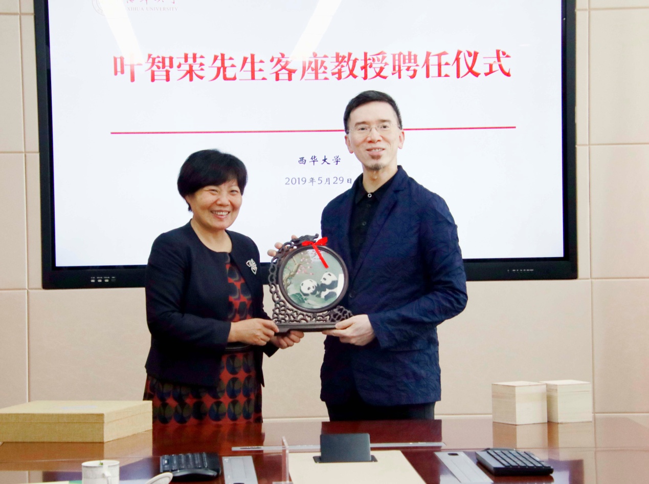 5月29日下午2:20,叶智荣客座教授聘任仪式在办公楼510会议室举行,国际知名产品设计师、香港设计商会主席、香港博物馆专家顾问(设计)、香港叶智荣设计有限公司负责人叶智荣先生,我校党委书记边慧敏、副校长费凌,以及发展规划部、人事处、科技处、美术与设计学院、四川质量发展研究院相关负责人出席了聘任仪式。仪式由费凌主持。