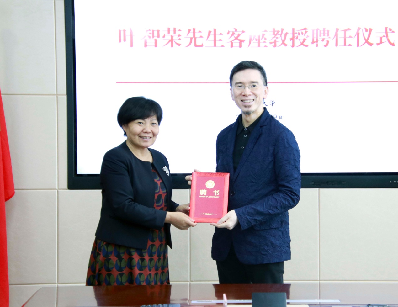 校党委书记边慧敏为叶智荣先生颁发客座教授聘书