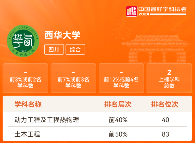 10月15日,高等教育评价专业机构软科正式发布“2024软科中国最好学科排名”,我校两个学科新增上榜,动力工程及工程热物理学科进入排行榜前40%,土木工程学科进入排行榜前50%。
