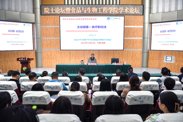 10月24日,中国工程院院士、国际食品科学院院士、党的二十大代表、南昌大学谢明勇教授莅临我校为师生作学术报告并指导学科建设。学术报告会由副校长邵永波主持,食品与生物工程学院领导班子和师生代表300余人参加了报告会。