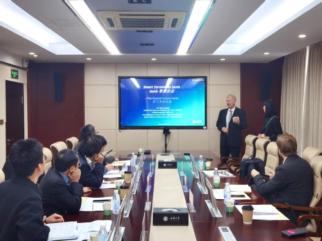 会上,于韦斯屈莱应用科技大学首席研究员Hannu Haapala教授介绍了于韦斯屈莱应用科技大学在现代农业机械化、智能农场研发、智慧农业模式等方面的发展。我校相关学院以及研究院也与Hannu Haapala教授交流了各自在智能农场、低空农业生产、丘陵农机装备研发等方面的情况。