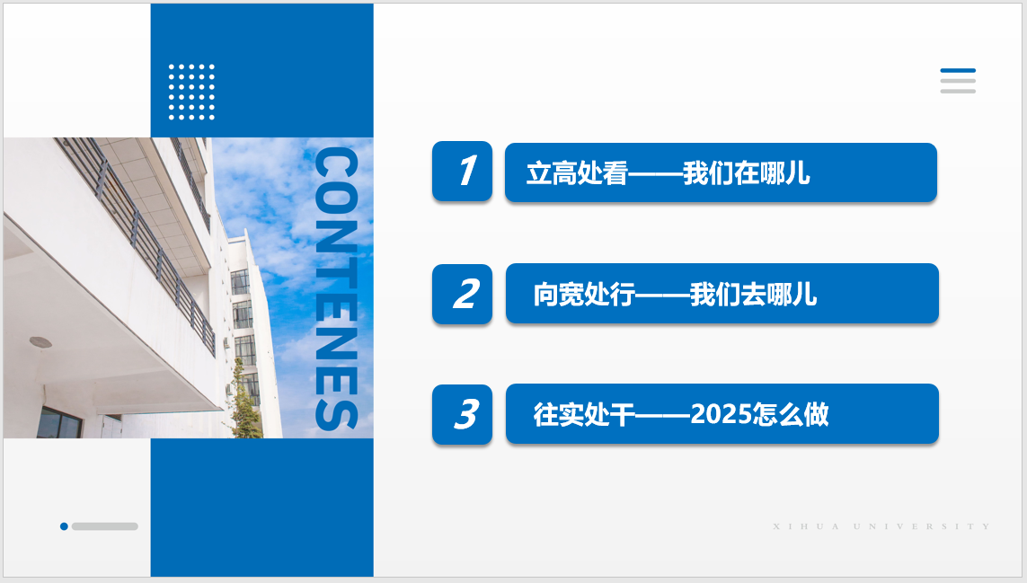 下午好!我代表食品与生物工程学院对2025年的相关重点工作进行汇报。汇报的题目是“加强谋篇布局 推动学科发展”。我将从“立高处看、向宽处行、往实处干”三个方面进行汇报。