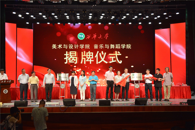 四川省政协副主席王正荣,四川省政协文体艺卫专委会驻会副主任凌娟,郫都区区委常委、宣传部长尹贤鹏,四川省教育厅体卫艺术处处长李孝武,四川省文化厅剧目工作室主任丁鸣,我校党委书记边慧敏为音乐舞蹈学院揭牌;四川省政协副秘书长李华锋,四川省教育厅巡视员王康,四川省委宣传部文艺处副处长黄俊鹏,四川大学艺术学院院长黄宗贤,四川音乐学院美术学院院长杨为渝,我校校长刘清友为美术与设计学院揭牌。