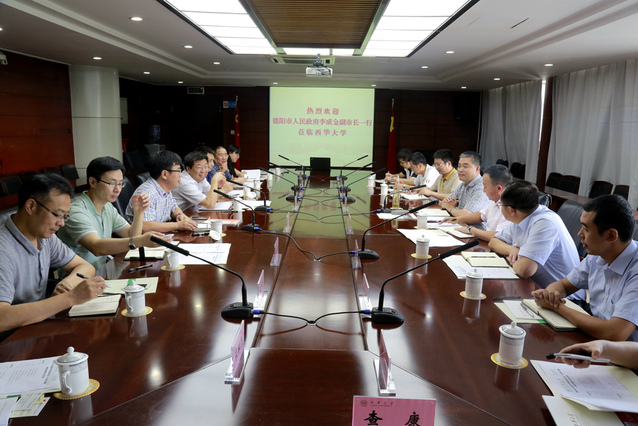 7月26日上午,德阳市人民政府李成金副市长一行8人来校就贯彻落实市校战略合作协议、深入推进军民融合和通航产业发展进行考察洽谈,共商市校合作事宜。副校长王政书,党政办公室、发展规划处、科技处、基建处、教务处、军民融合处、后备军官学院等相关部门负责人在行政楼212会议室与来宾进行了座谈。发展规划处处长张力主持会议。