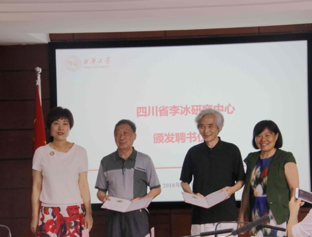 边慧敏书记、赵静副主任为四川省李冰研究中心学术顾问谭继和、邹礼洪,以及四川省李冰研究中心主任谢应光、四川省李冰研究中心第一届学术委员会主任潘殊闲颁发了聘书。