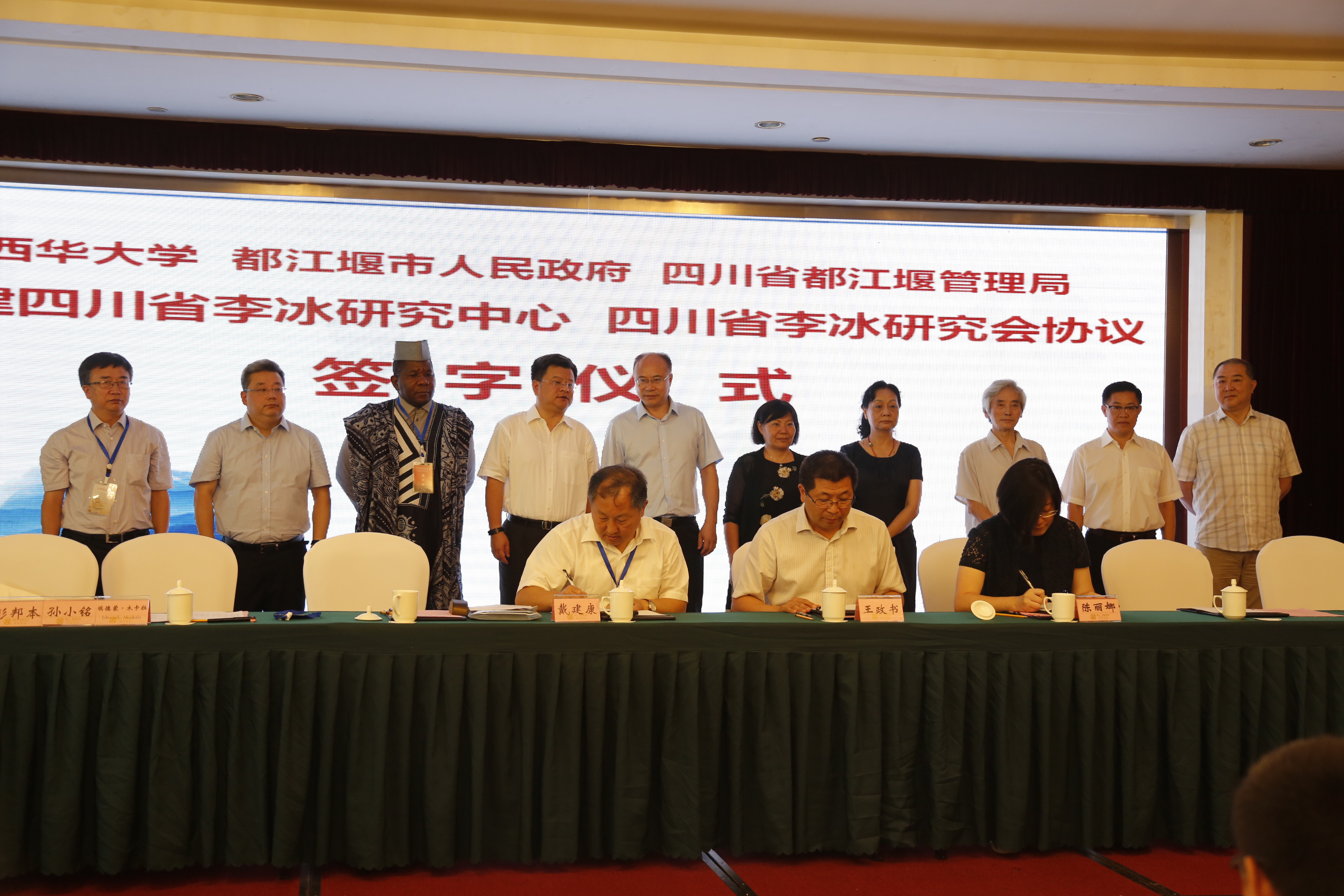现场,王政书副校长、陈丽娜副市长、戴建康副局长签署共建四川省李冰研究中心、四川省李冰研究会协议。