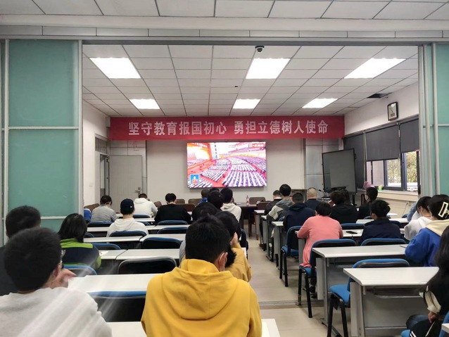 学校组织学生在四教报告厅集中收看