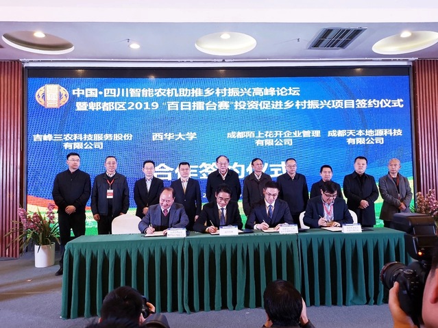 会议还举行了项目推介和郫都区2019“百日擂台赛”投资促进乡村振兴项目签约仪式。其中,费凌副校长代表学校与吉峰三农科技服务有限公司、成都陌上花开企业管理有限公司、成都天本地源科技股份有限公司共同签署了“共建现代农机智能装备产业园”战略合作协议。